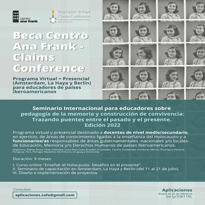 Centro Ana Frank de Argentina y Claims Conference invitan a docentes y educadores de toda Iberoamérica a aplicar a la Beca para el «Seminario Internacional para educadores sobre pedagogía de la memoria y construcción de convivencia: Trazando puentes entre el pasado y el presente. Edición 2022». La fecha límite para aplicar para el curso es el 25 de febrero de 2022.