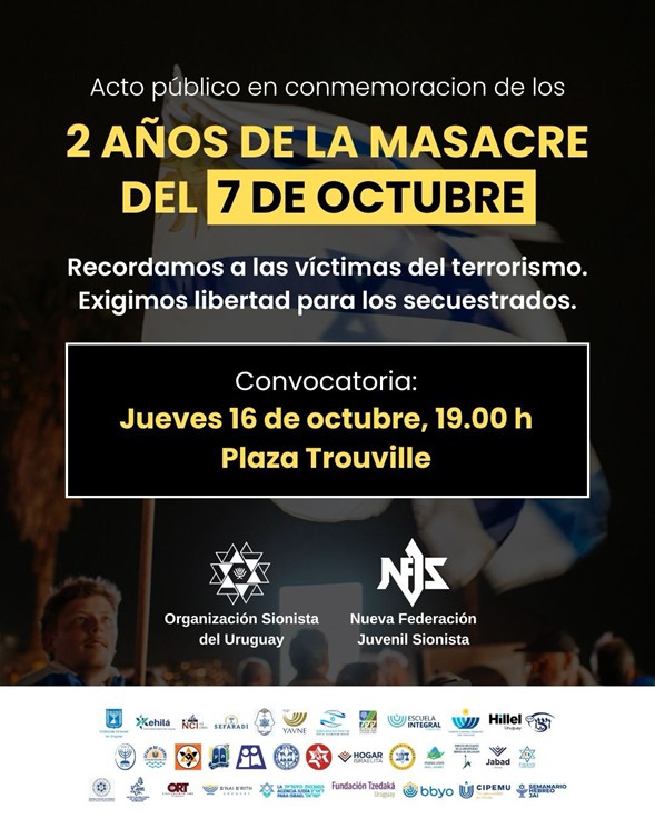 El próximo jueves 16 de octubre nos congregamos para recordar y homenajear a las víctimas de los ataques del 7 de octubre de 2023 y en celebración del acuerdo de paz. 📅 Jueves 16/10 a las 19.00 h 📍 Plaza Trouville Acompañanos en este acto de memoria, unidad y esperanza.