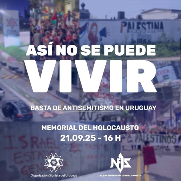 Los movimientos juveniles judíos (nucleados en la Nueva Federación Juvenil Sionista) junto a la Organización Sionista del Uruguay invitan a la colectividad judía uruguaya a participar de una concentración contra el antisemitismo, el domingo 21 de setiembre a las 16 hs. en el Memorial del Holocausto. BASTA DE ANTISEMITISMO EN URUGUAY Desde los movimientos juveniles,