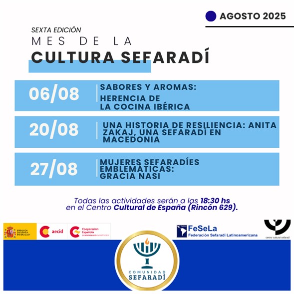 Como es habitual en todos los agostos desde 2019, este 2025 vuelve a realizarse el Mes de la Cultura Sefaradí, que surgiera del estrecho contacto entre la Comunidad Israelita Sefaradí del Uruguay y la Embajada de España. Una serie de actividades que se realizan los días 6, 20 y 27 de agosto en el Centro