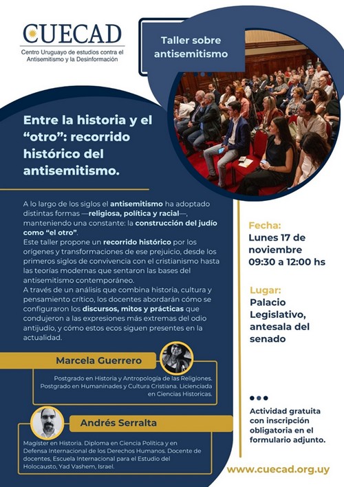 El 17 de noviembre tuvo lugar, en el Palacio Legislativo, la charla “Entre la historia y el ‘otro’: recorrido histórico del antisemitismo”, organizada por CUECAD, el Centro Uruguayo de Estudios contra el Antisemitismo y la Discriminación, fundado por Vera Bernheim, Erica Yac y Janet Rudman. Estuvo el CCIU representado por su Presidente Roby Schindler y