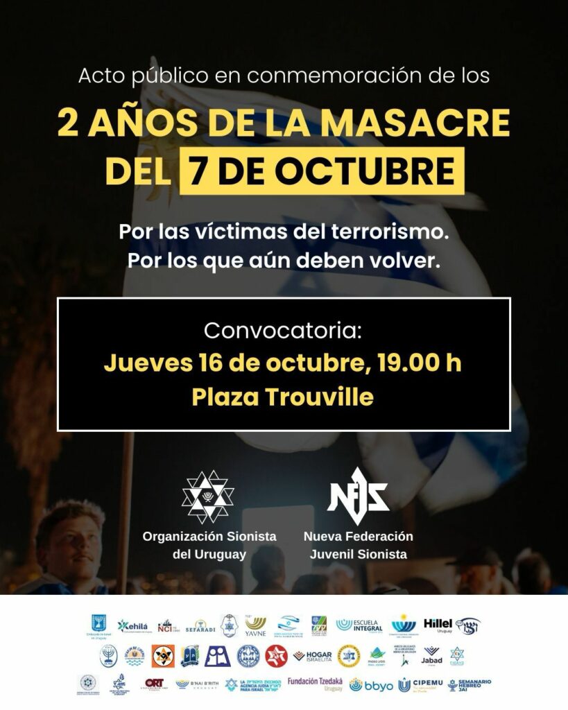 Hoy jueves 16 de octubre nos congregamos para recordar y homenajear a las víctimas de los ataques del 7 de octubre de 2023, en celebración del acuerdo de paz y pidiendo por el retorno de los cuerpos que aun faltan. Jueves 16/10 a las 19.00 h Plaza Trouville Acompañanos en este acto de memoria,
