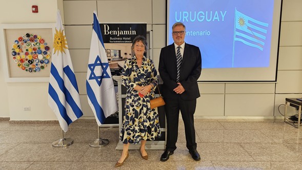Con motivo del bicentenario de la independencia de Uruguay, el Embajador de Uruguay ante el Estado de Israel, Sr. Manuel Etchevarren, y su esposa, Sra. Ana Solivellas, ofrecieron una recepción en el Hotel Benjamin de Herzliya Pituach. El salón estaba decorado con las banderas nacionales de Uruguay e Israel, un póster del músico más emblemático