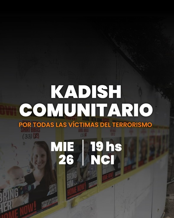 En días de profundo dolor para el pueblo judío, nos reunimos en comunidad para elevar nuestras plegarias por la elevación de las almas de las víctimas del terrorismo. Invitamos a todos a un kadish comunitario con los Rabanim Daniel Dolinsky (NCI), Aarón Gulman (Kehilá) y Yehuda Ribco (CISU). Miércoles 26/2 19hs en la Nueva Congregación Israelita