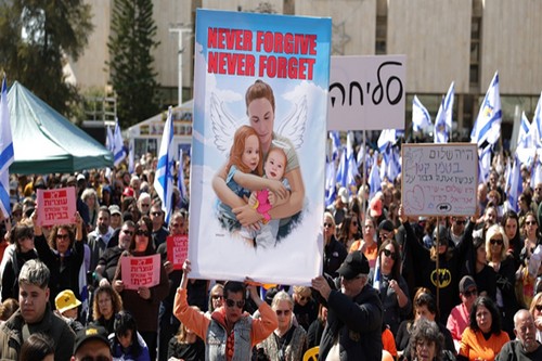 Todo ello, con una gran cantidad de banderas de Israel y fotos de los tres integrantes de la familia asesinados en Gaza.