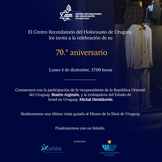 El lunes 4 de diciembre a las 17 hs., el Centro Recordatorio del Holocausto invita a la celebración del 70º aniversario del Museo del Holocausto y realizará la última visita guiada por sus instalaciones. El acto, auspiciado por el CCIU, contará con la participación de la Vicepresidenta Beatriz Argimón y la Embajadora de Israel en